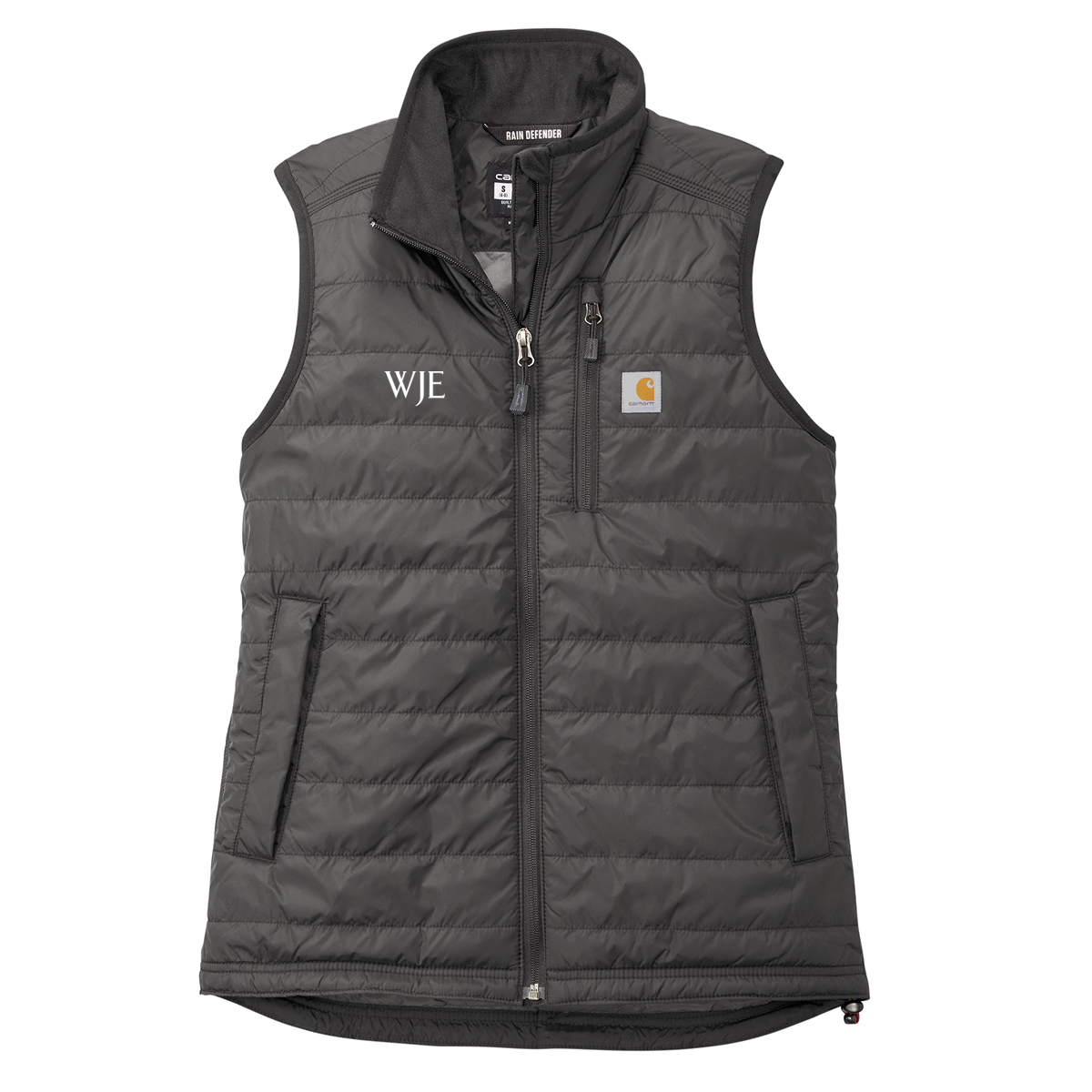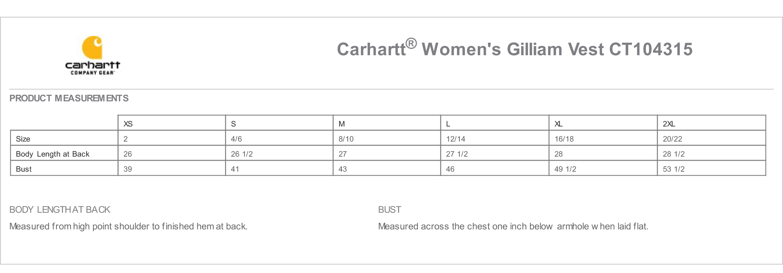 Keep working through cold, wet weather in this women’s version of our popular Gilliam Vest. 1.75-ounce, 100% nylon Cordura shell Rain Defender durable water repellent Wind Fighter technology tames wind. Nylon lining quilted to 100-gram polyester insulation. Reverse coil center front zipper. Zip-through collar. Left chest map pocket with reverse coil zipper. Two hand pockets with hidden snap closures Two interior pockets: one zippered, one hook and loop closure. Drawcord adjustable drop tail hem. Carhartt-strong, triple-stitched main seams Carhartt label sewn on chest pocket. Relaxed fit